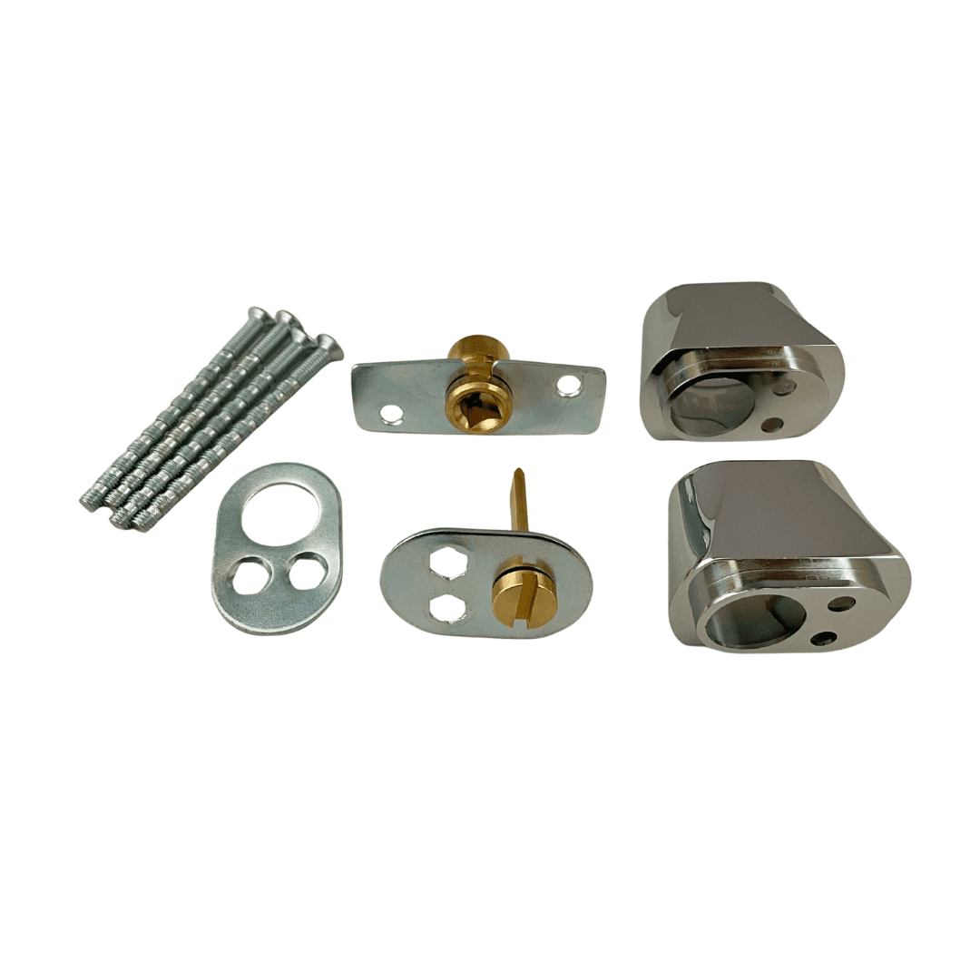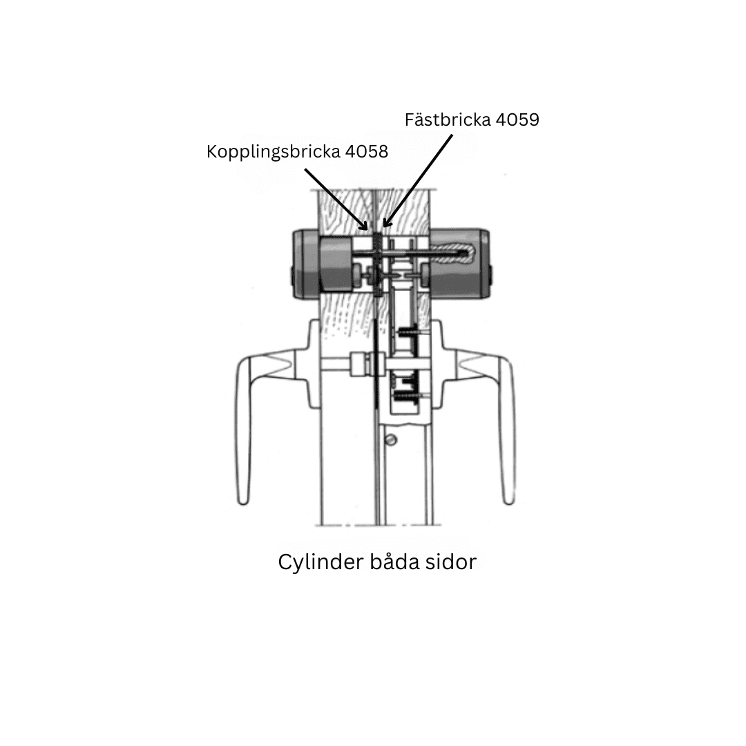 Beslagspaket för låsbar spanjolett med kopplad båge för cylinder på båda sidor.
