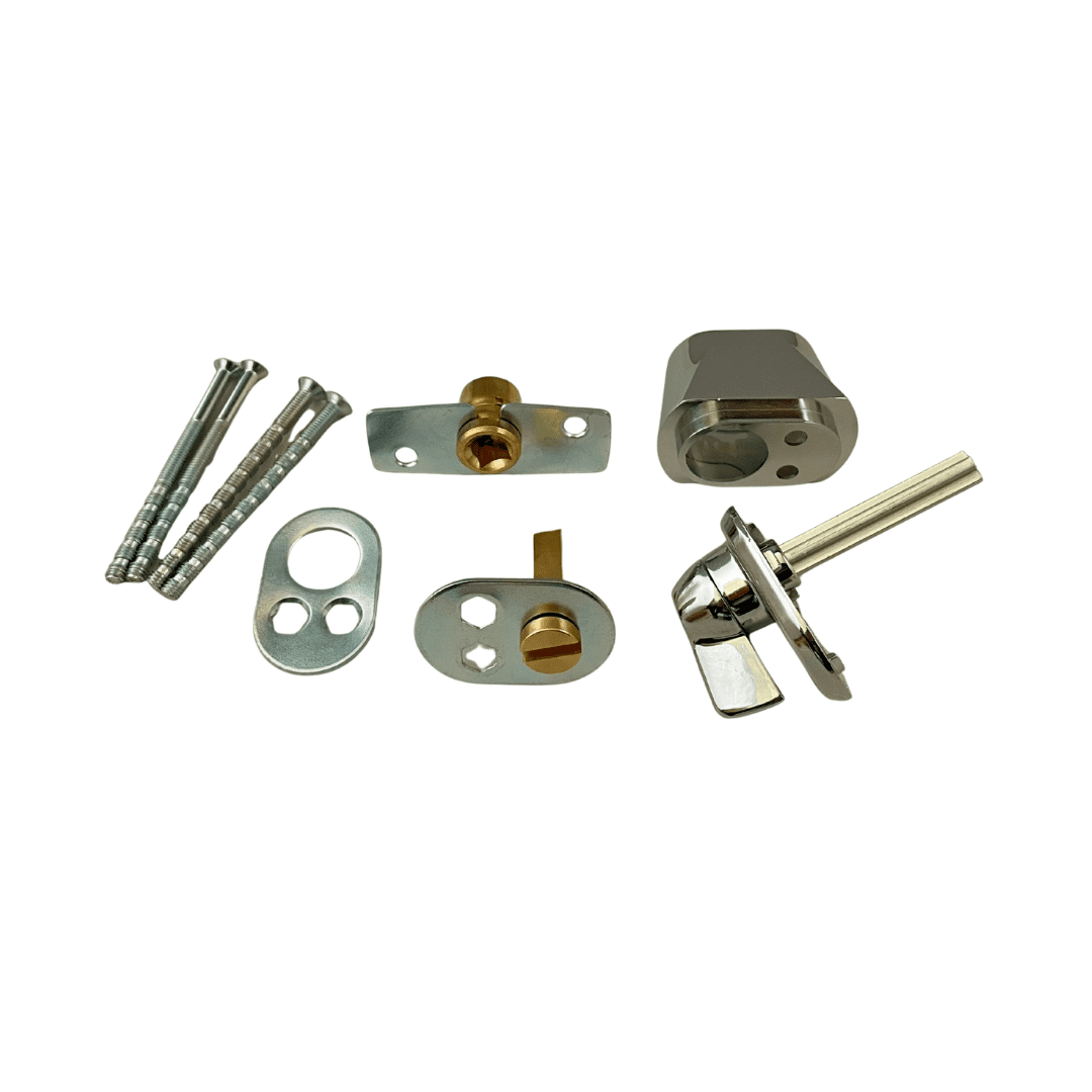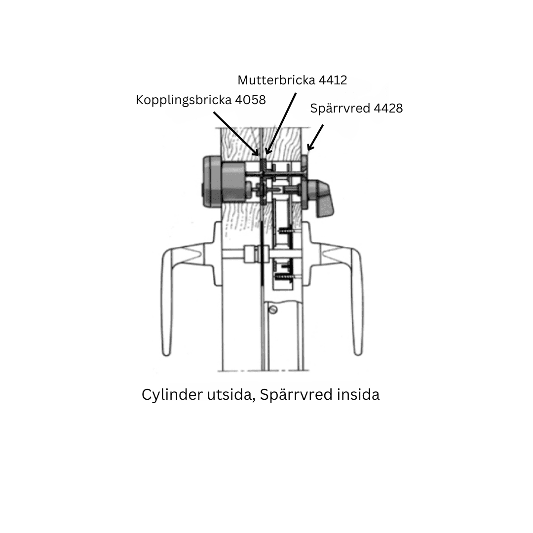 Beslagspaket för låsbar spanjolett med kopplad båge för cylinder på utsidan och vred på insidan.