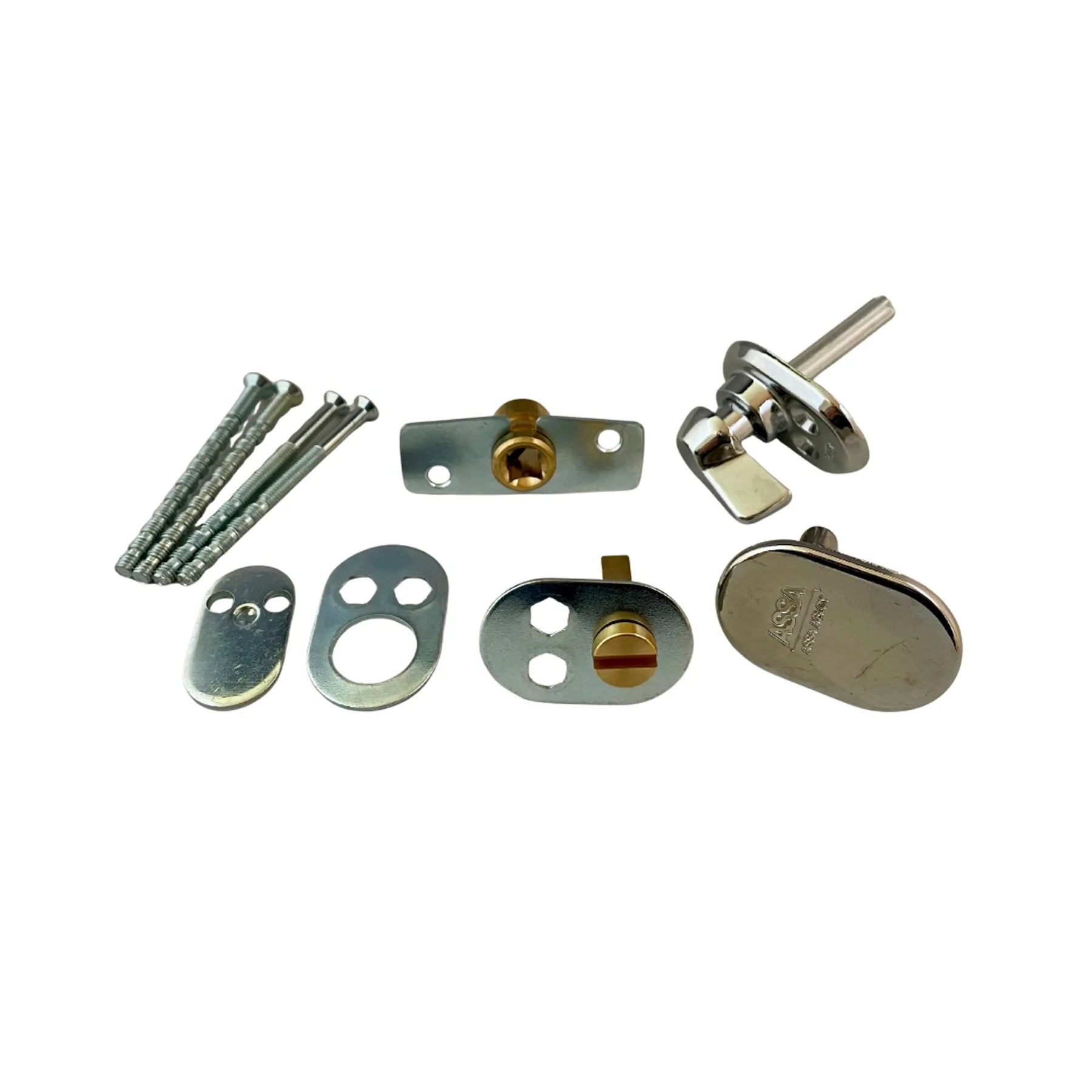 Beslagspaket för låsbar spanjolett med kopplad båge för vred på insidan och täckbricka på utsidan.