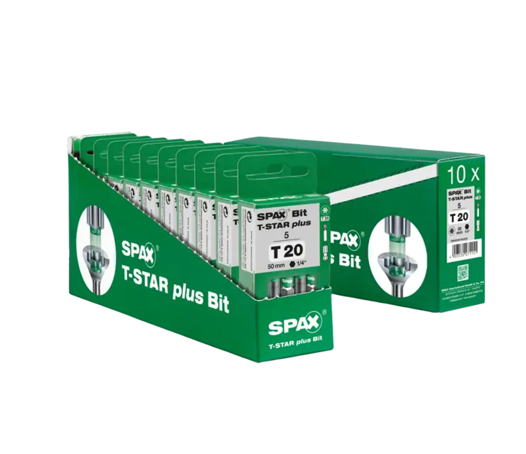 Med SPAX T-STAR plus-bits får du bättre kraftöverföring genom perfekt passform, längre livslängd och snabbare gängning. Bitsens rena passform innebär också bättre vägledning, till exempel vid skruvning över huvudhöjd.