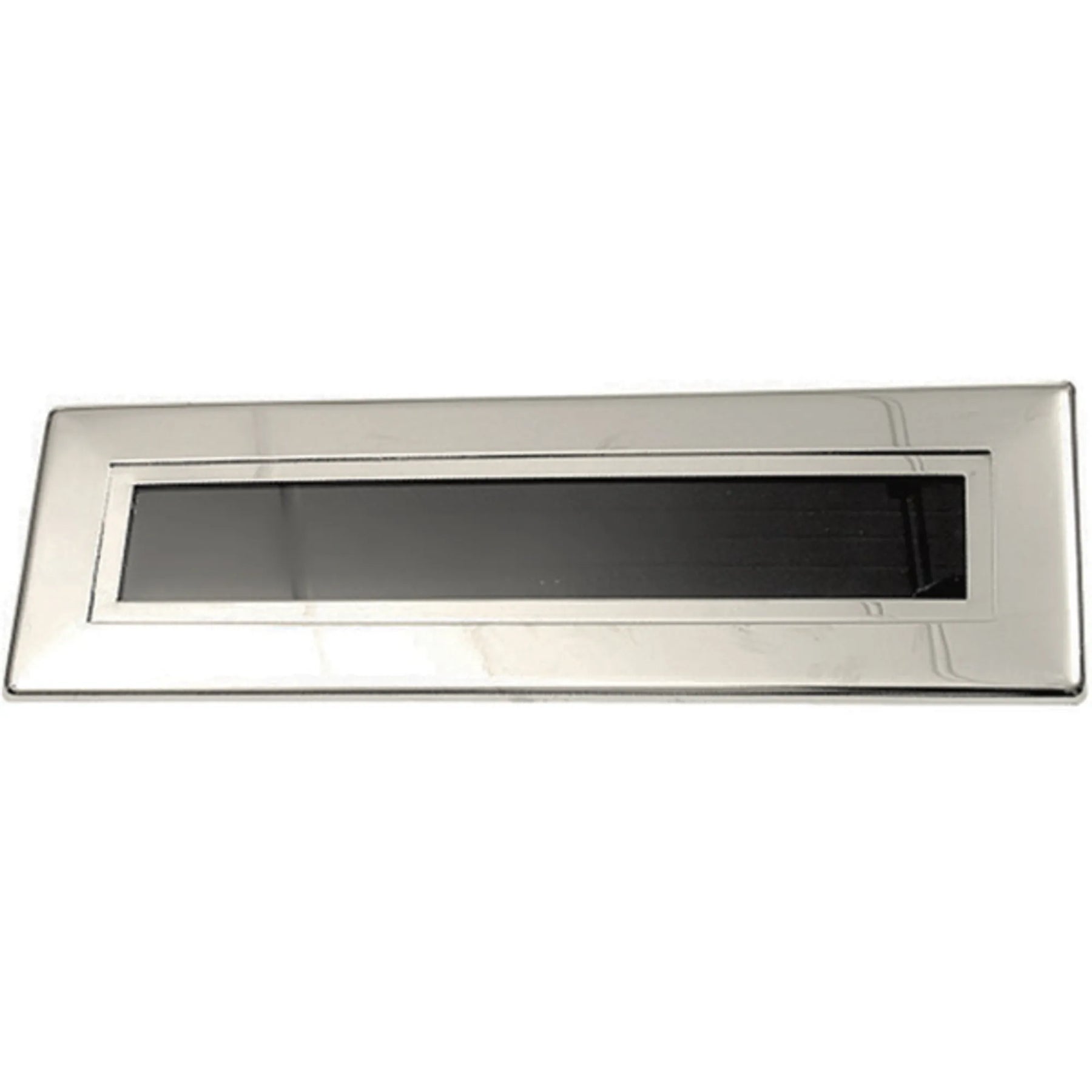 Ett brevinkast av mässing som har en svart pannå för bokstäver.