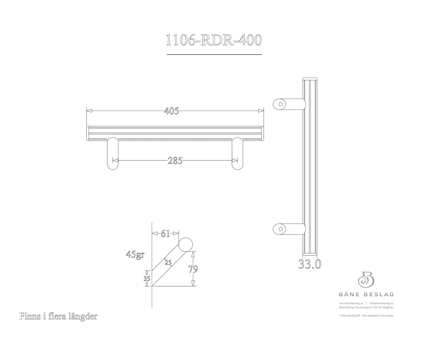 Draghandtag 1806 är av premiumkvalité helt i rostfritt stål komplett med fästen i samma material. Detta handtag har en tidlös och elegant design som utstrålar hållbarhet. och den polerade metallfinishen ger en blank yta som behåller sig fin över tid. Handtaget är vinklat i 45° för att inte täcka eventuell låscylinder. Det fungerar lika bra som draghandtag och tryckhandtag och är ofta monterad i par. Flertalet längder är tillgängliga som standard och måttbeställning är möjligt.