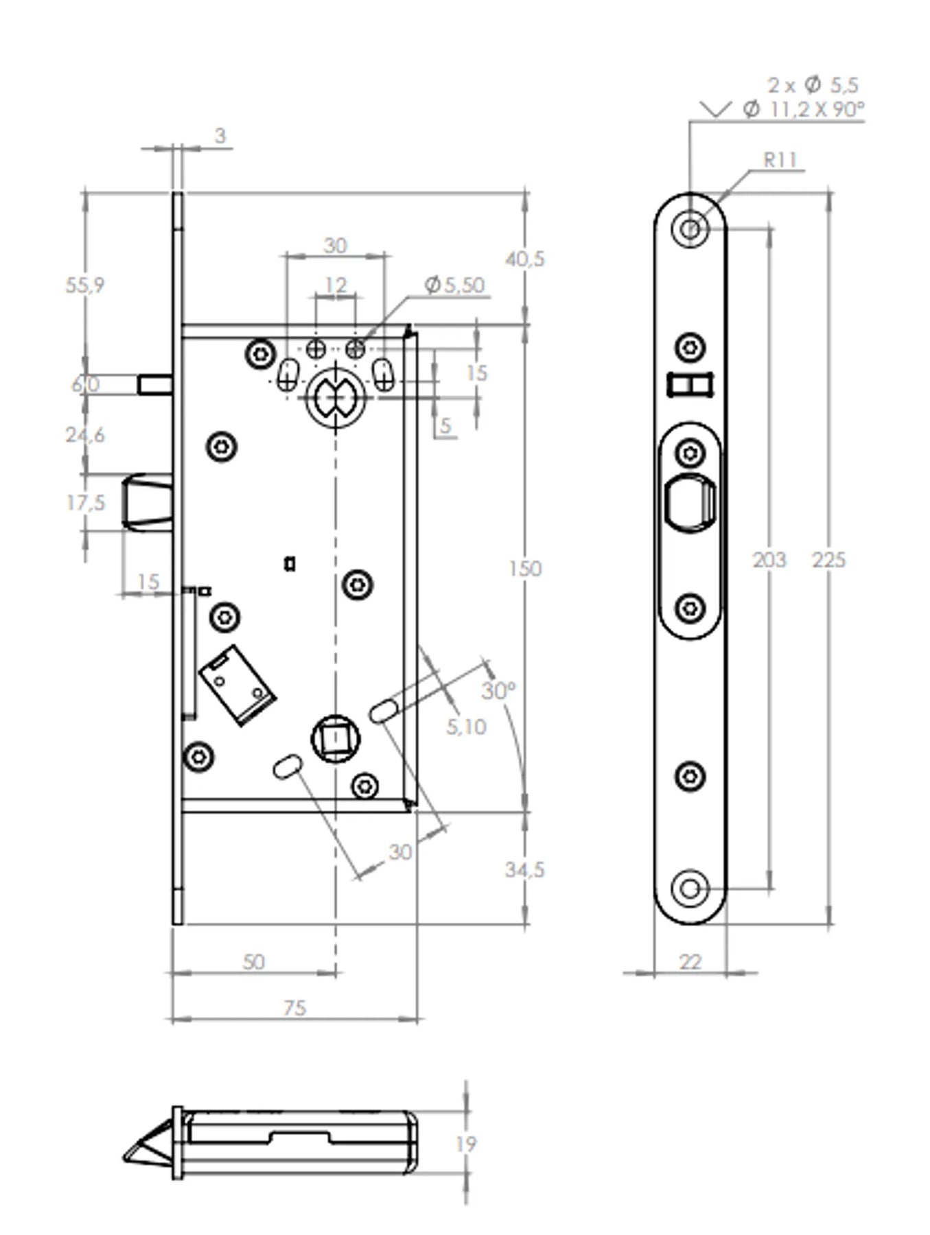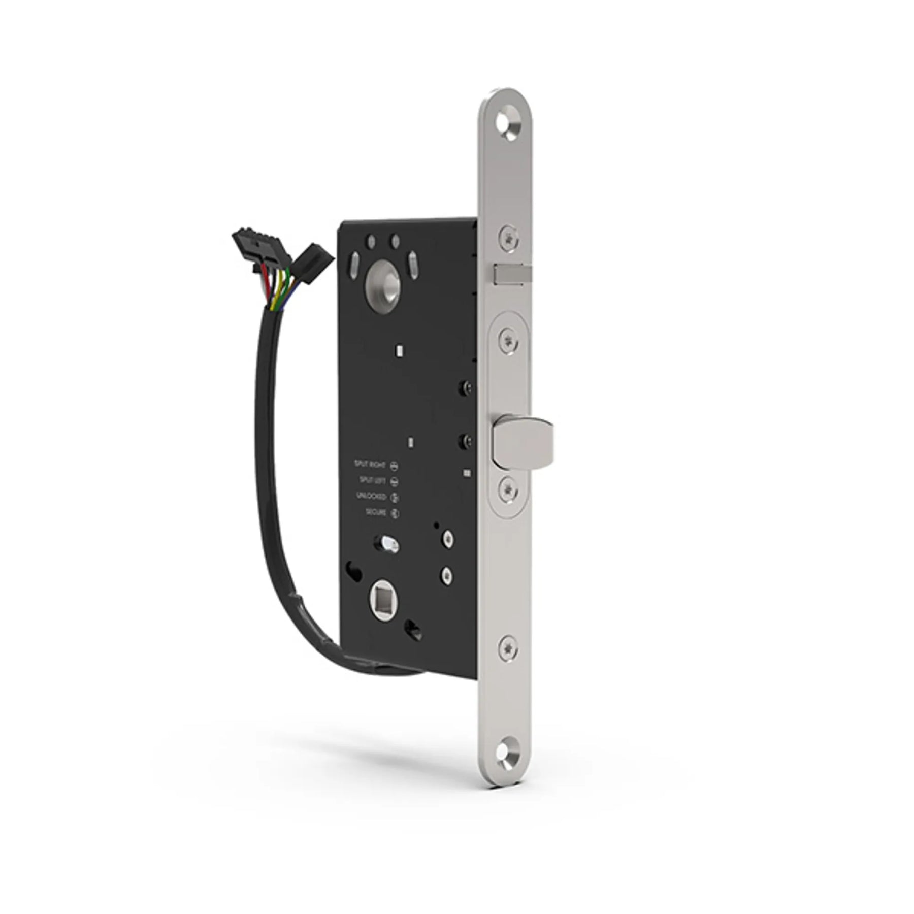 Split, trycket på ena sidan låset är alltid mekaniskt upplåst och kan därför alltid öppnas. Vilken sida är justerbart via funktionsväljaren.
