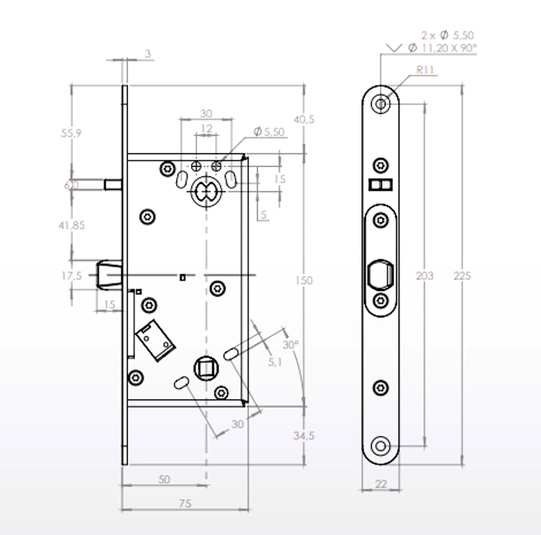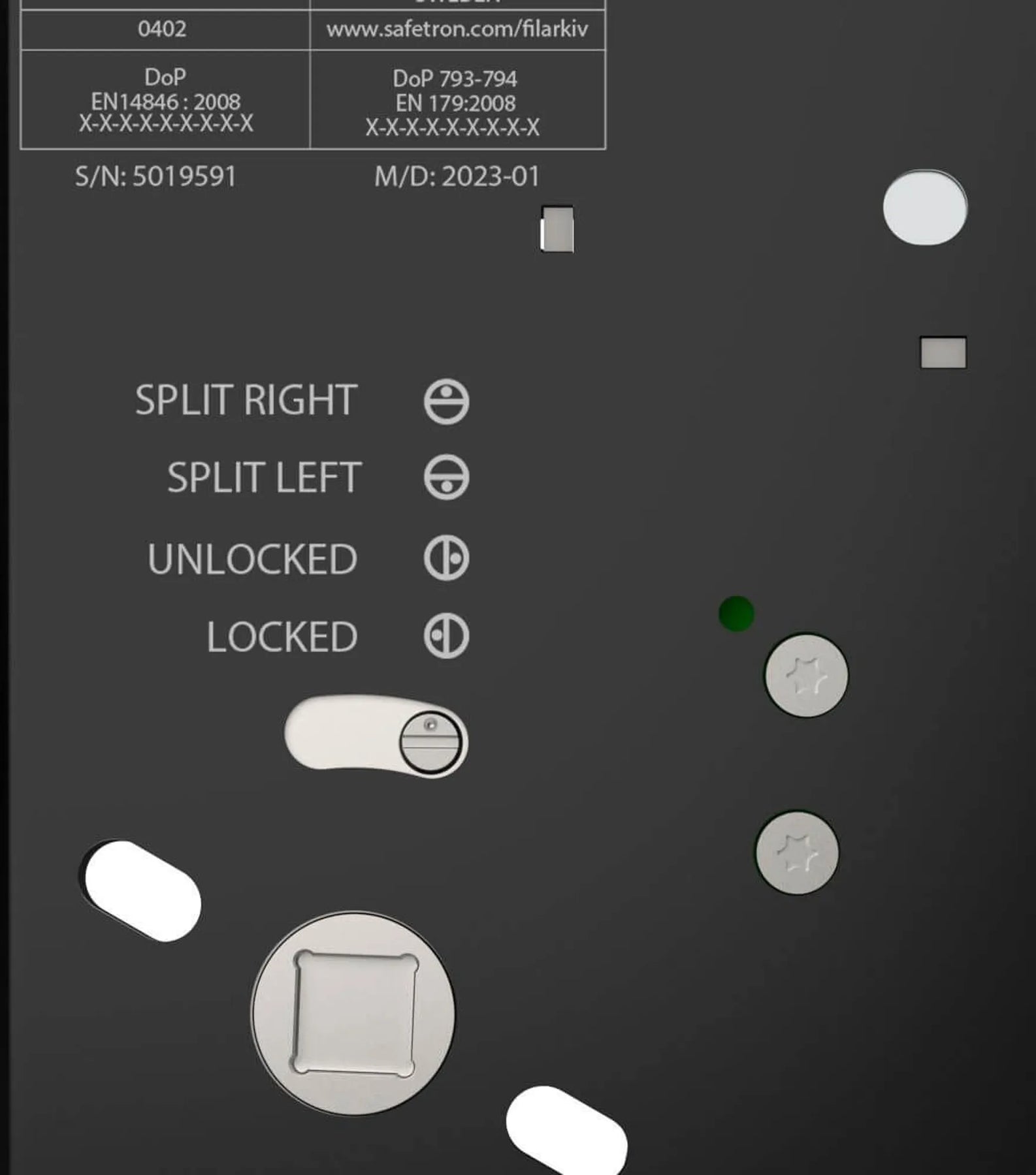 Split, trycket på ena sidan låset är alltid mekaniskt upplåst och kan därför alltid öppnas. Vilken sida är justerbart via funktionsväljaren.