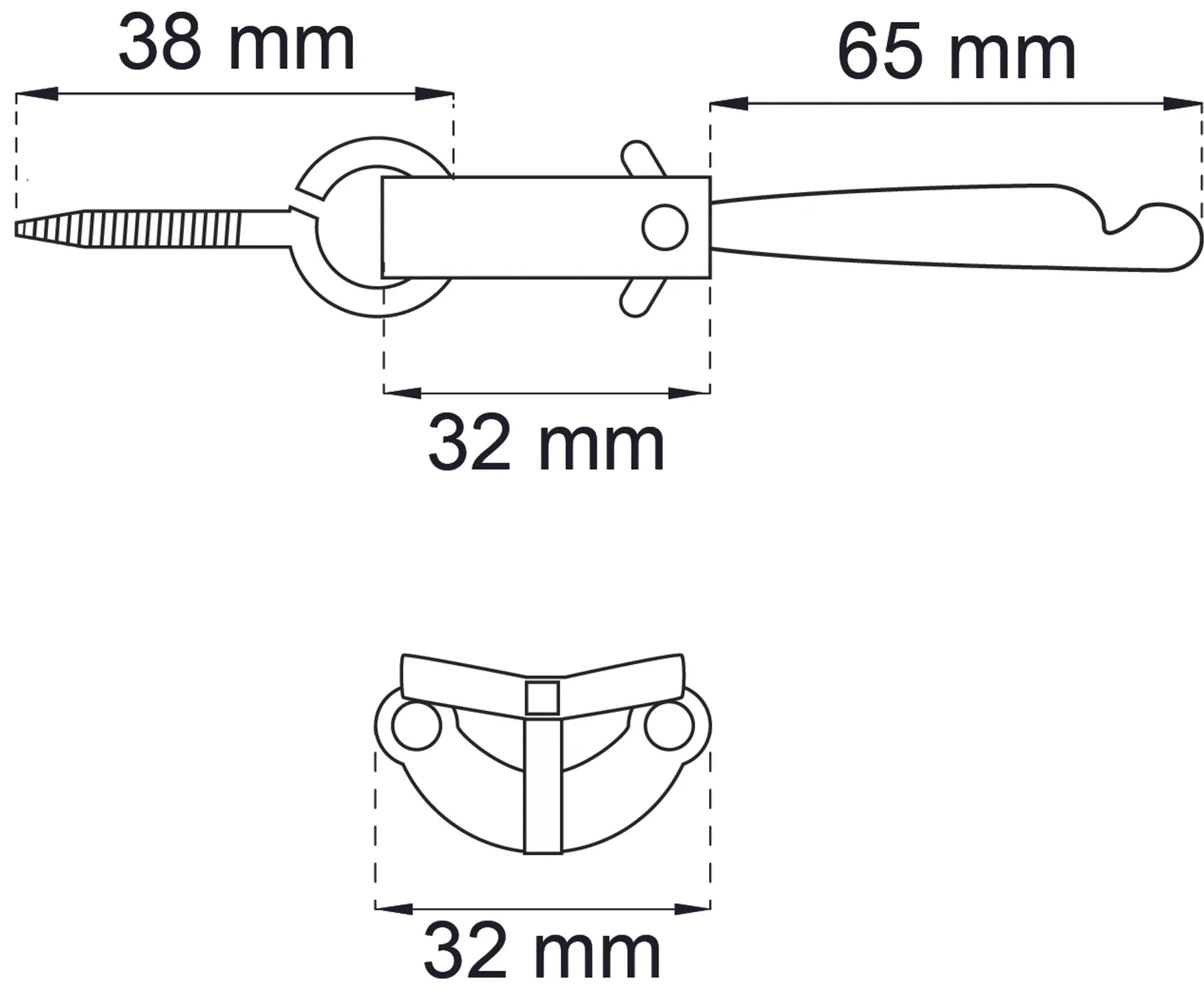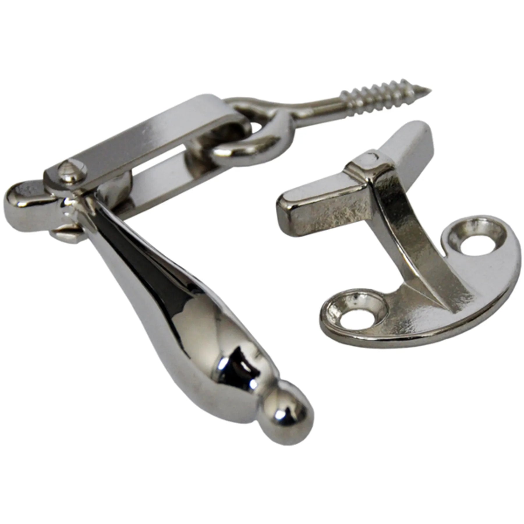 Fönsterlås av mässing för utåtgående fönster. Bygel 29 mm, 16 mm hake.