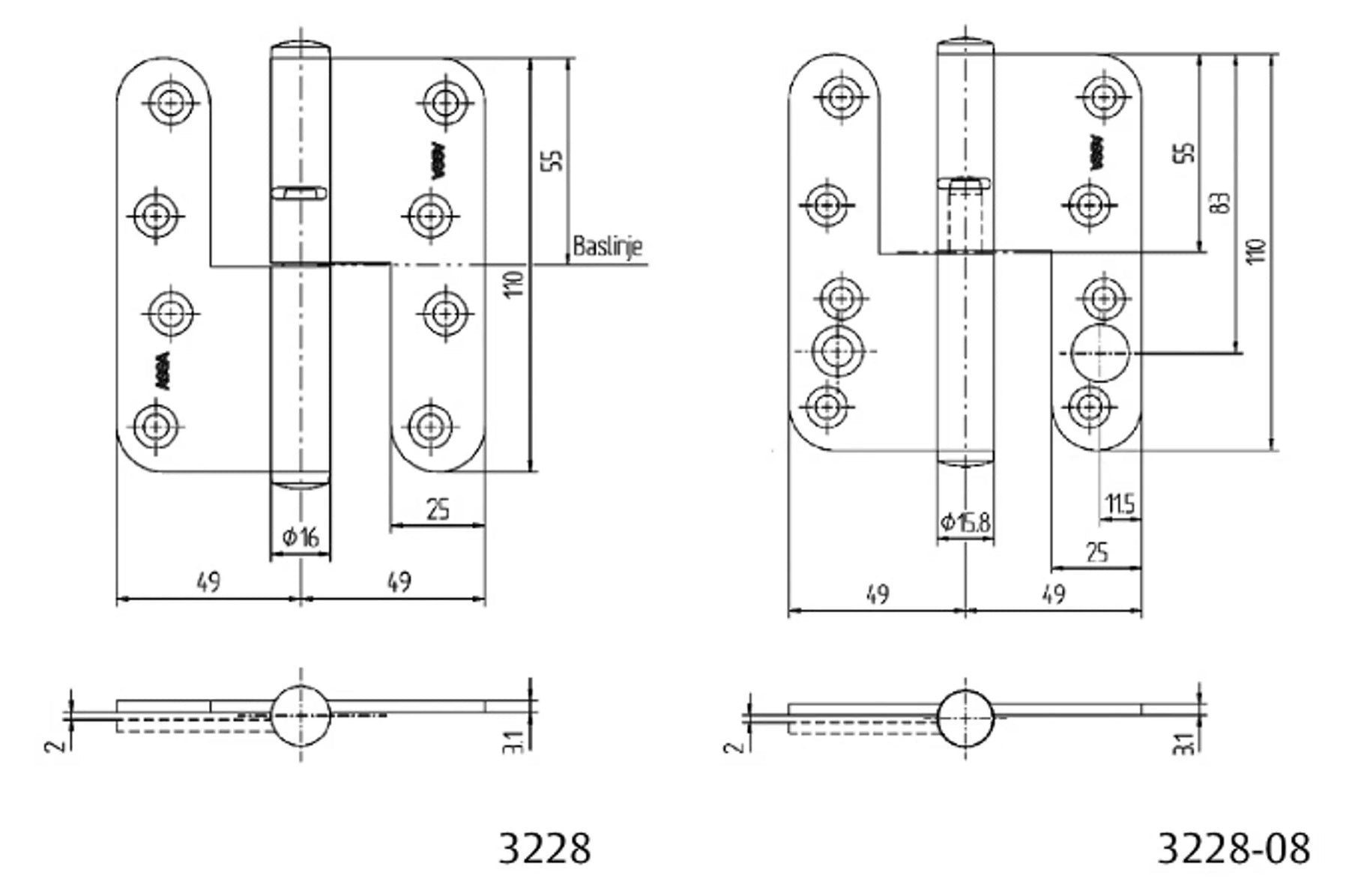 3228-110 är ett gångjärn för ofalsade dörrar, utåtgående fönsterdörrar etc med härdade ståltappar. Med brickinkasten kan du enkelt justera höjden.