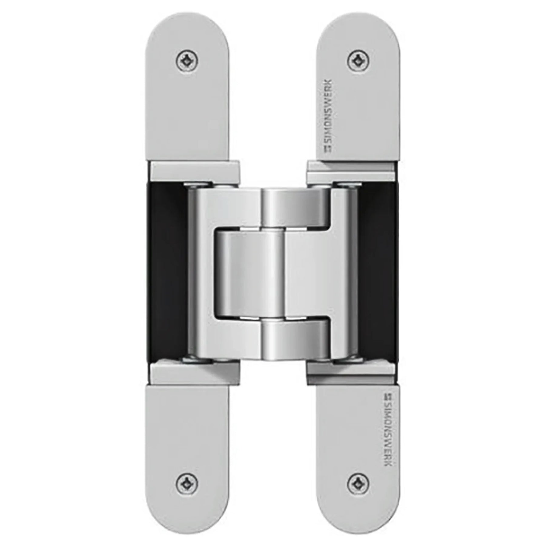 Infällt, dolt gångjärn i stål och aluminium för tunga dörrar.
