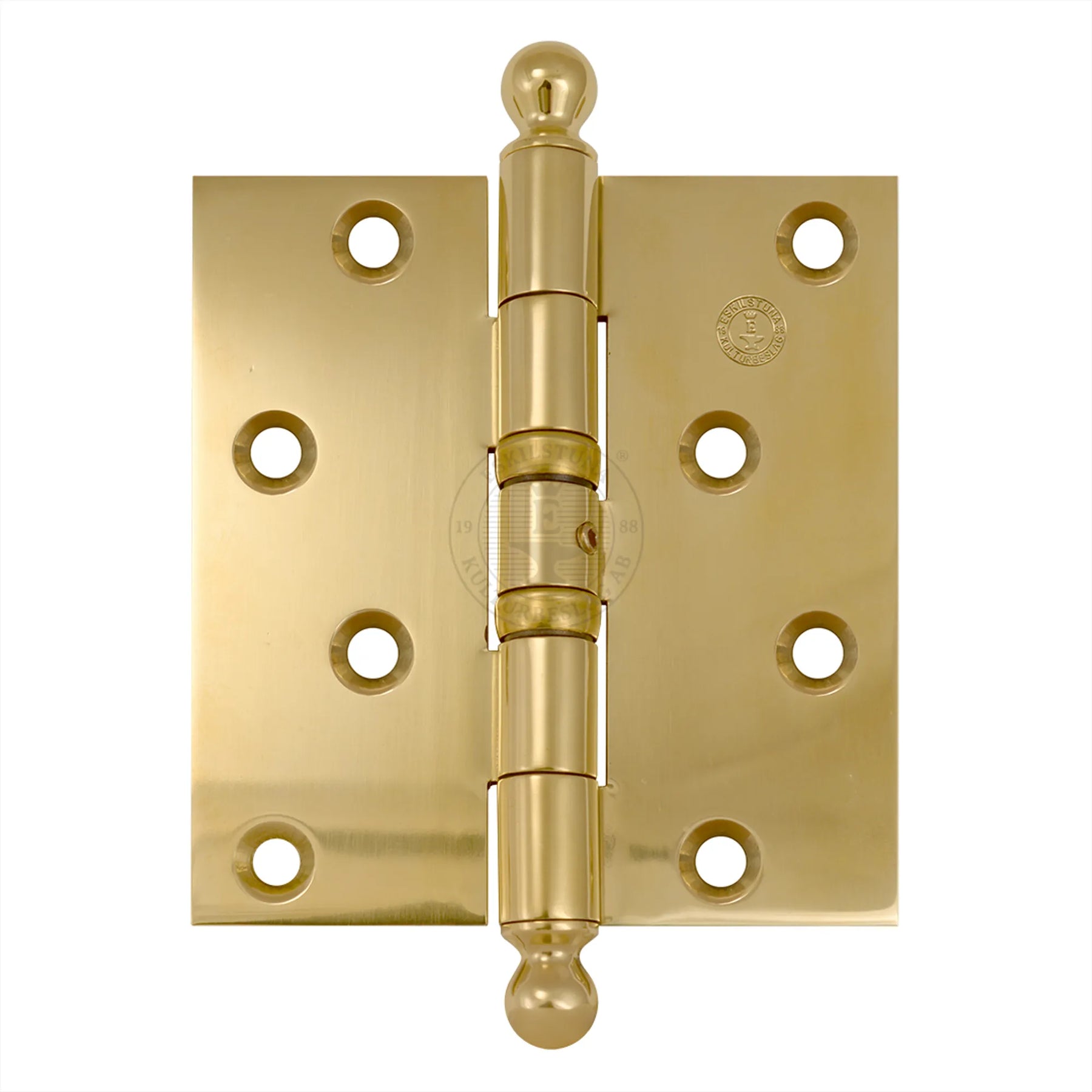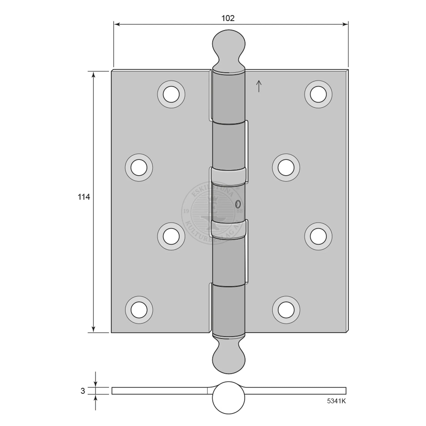 Kantgångjärn 5341 i mässing används för både höger- och vänsterhängd dörr. Vid montering skall loggan vara uppåt.
