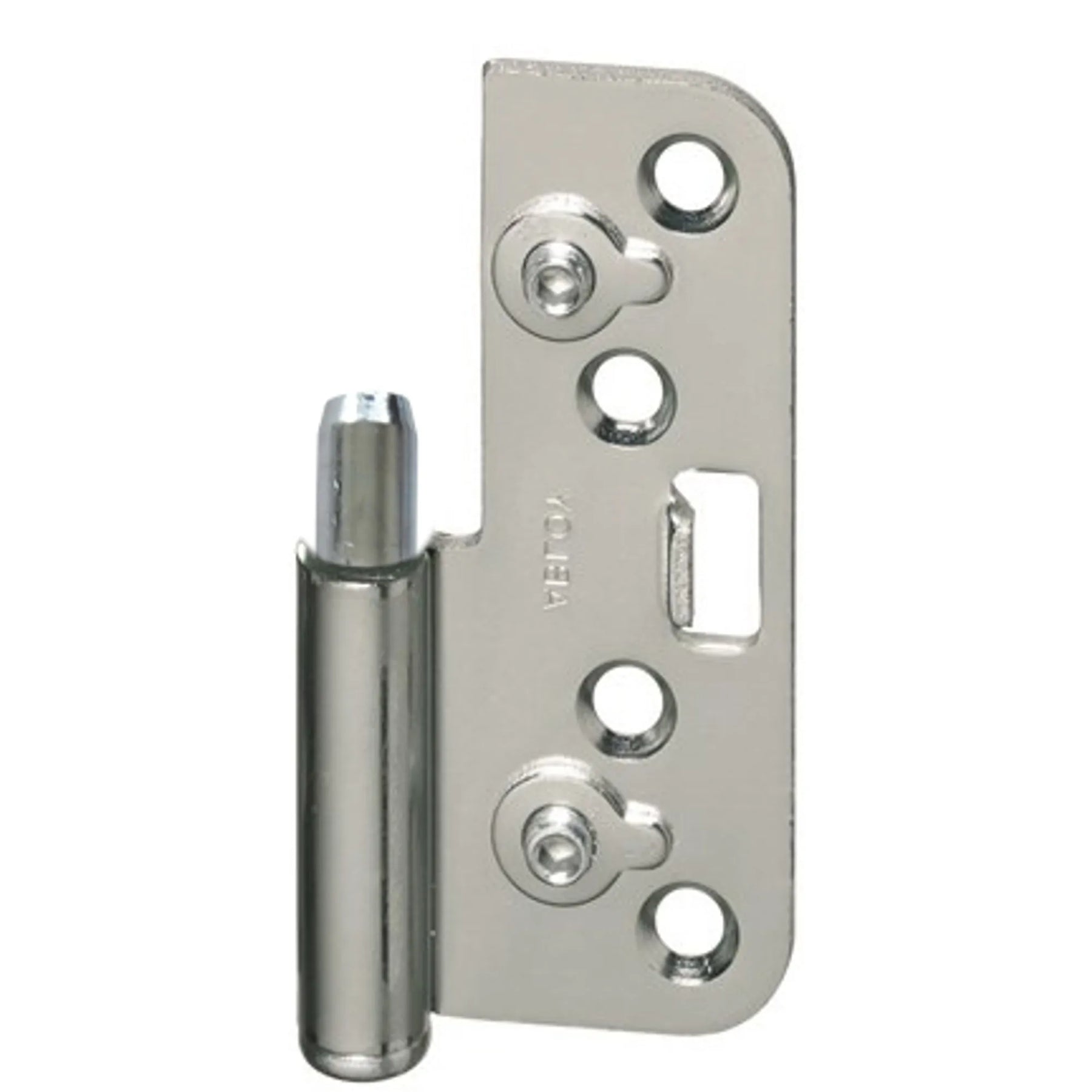 Tappbärande gångjärn för ofalsade dörrar med härdade ståltappar och fast bak-kantssäkring. CE-märkta, klass 13 enligt EN 1935. Steglös höjd- och sidojustering.