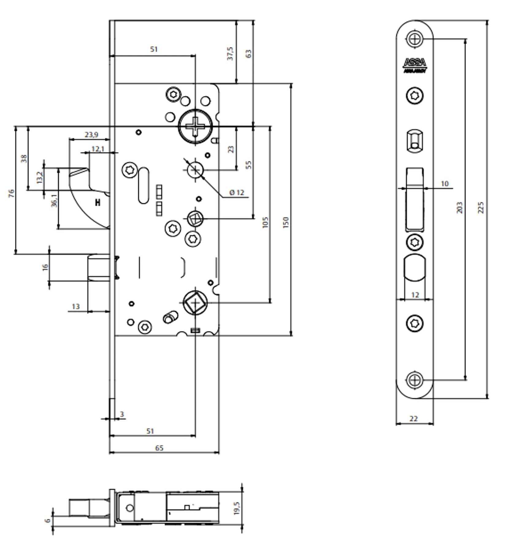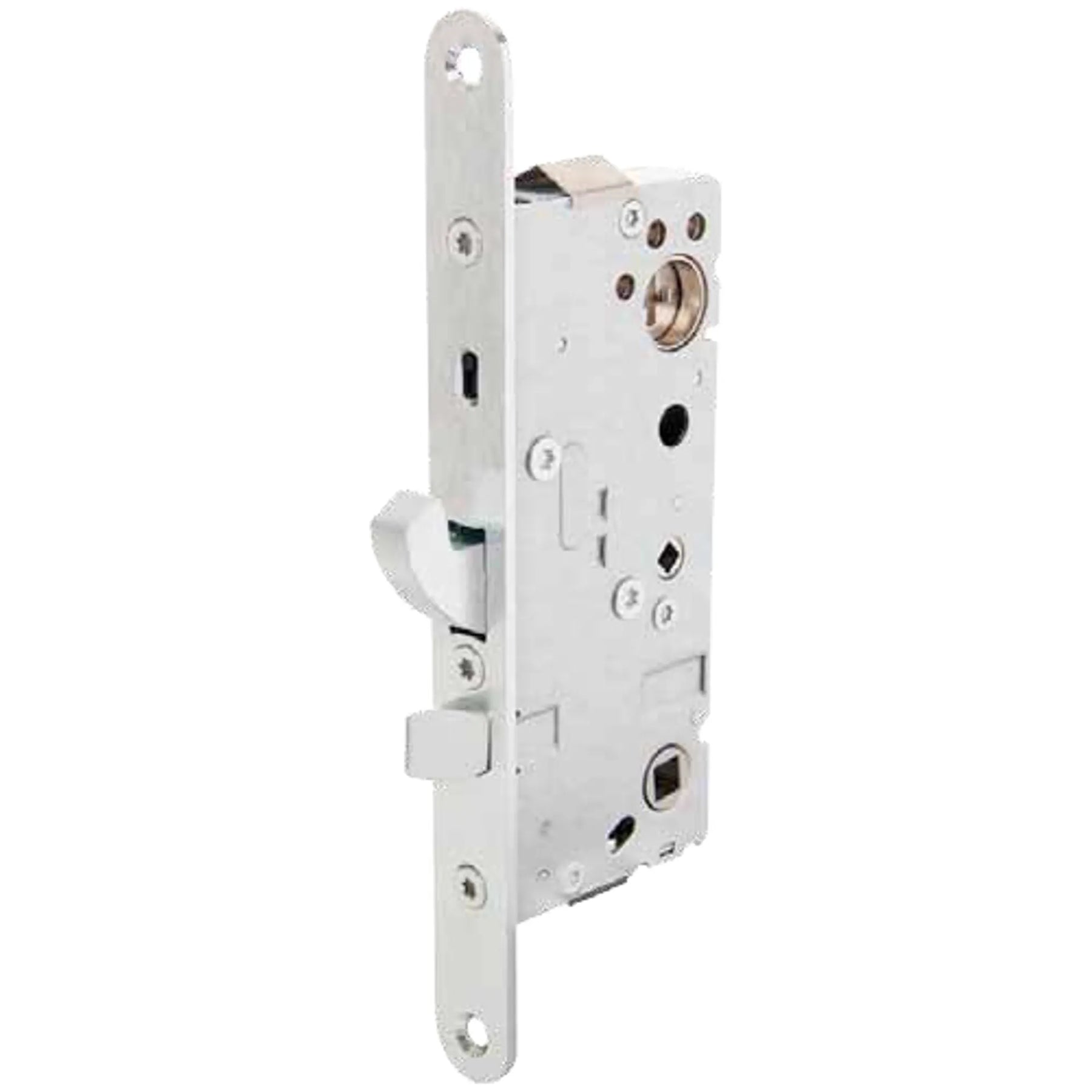 Låset har en blockeringsmekanism (uppställningsknapp) för vredfunktionen i stolpen. Hakregeln ger ett kopplande förband mellan dörr och karm.och är tvångsstyrd och härdad med en förstärkt förregling. Tryckesfallen är av stål för brandklassade dörrar och är vändbar för alternativ dörrhängning.