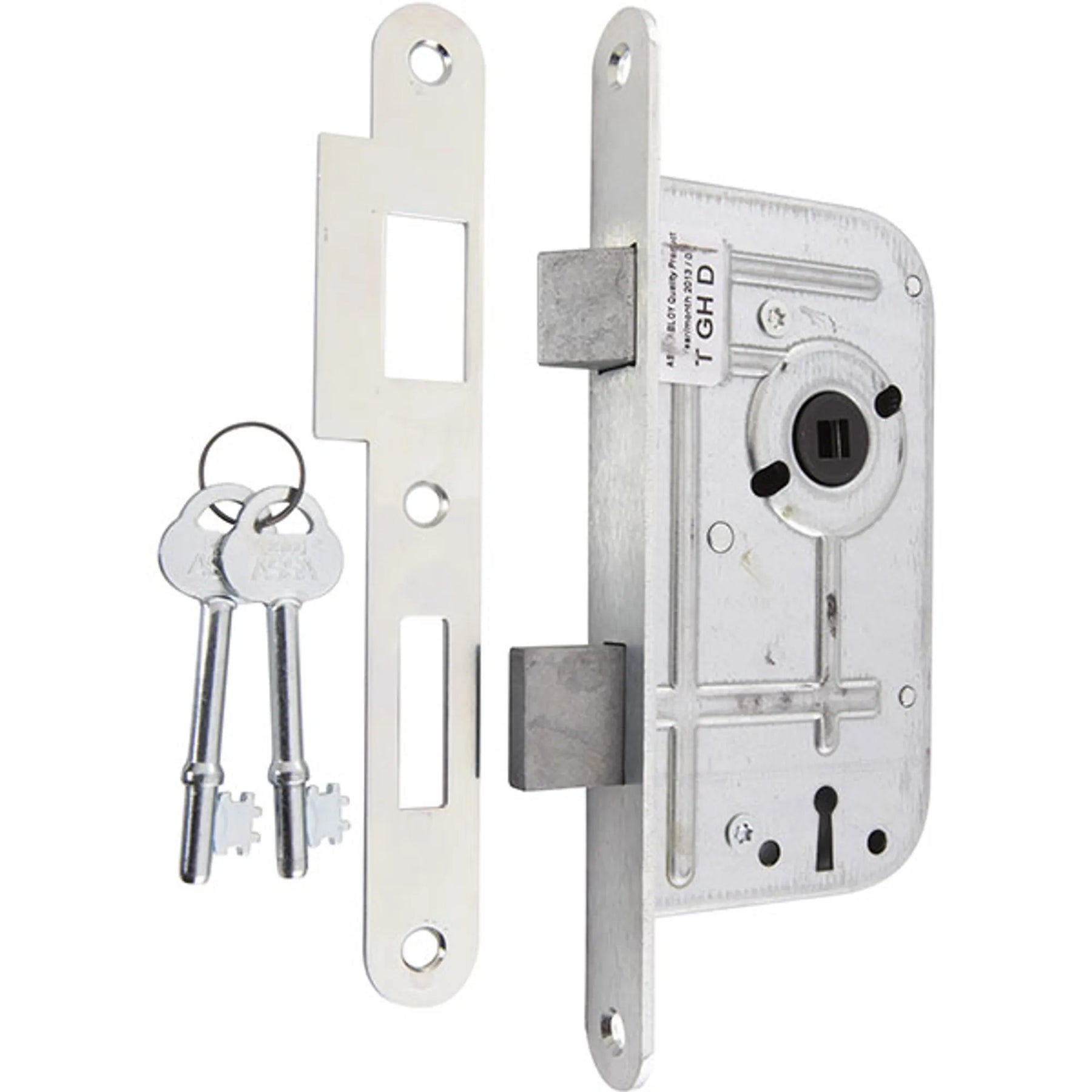 Låset har dorndjup 45 mm och 3-tillhållare med 44 olika nyckelkombinationer som manövereras med nyckel från både in- och utsidan. Fallkolven är vändbar vid demontering.