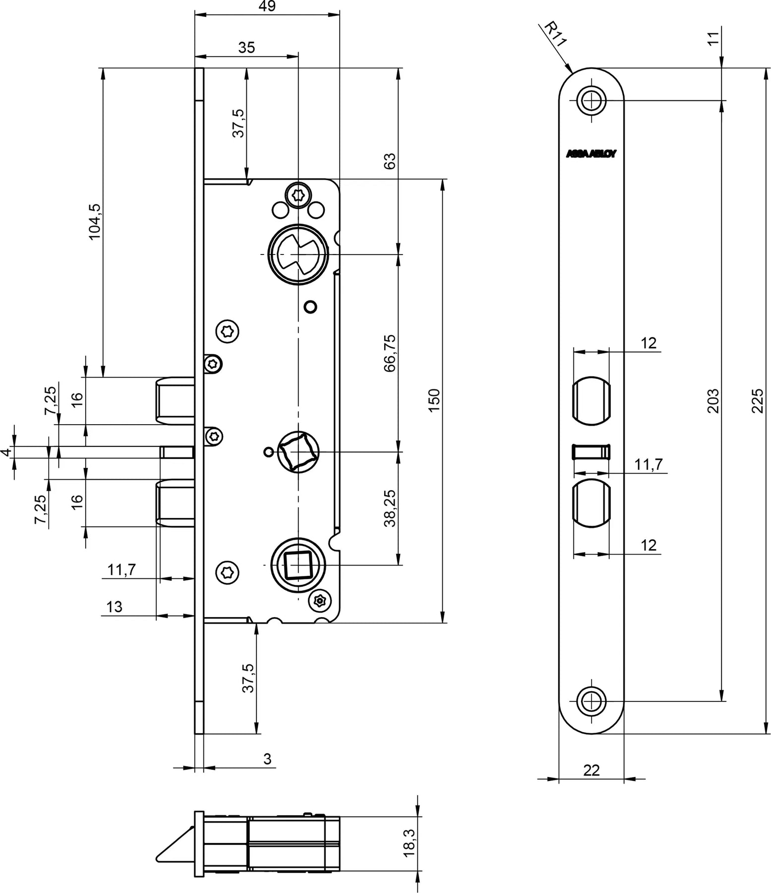 Låshus 722-35 - 727-35 - Måttskiss