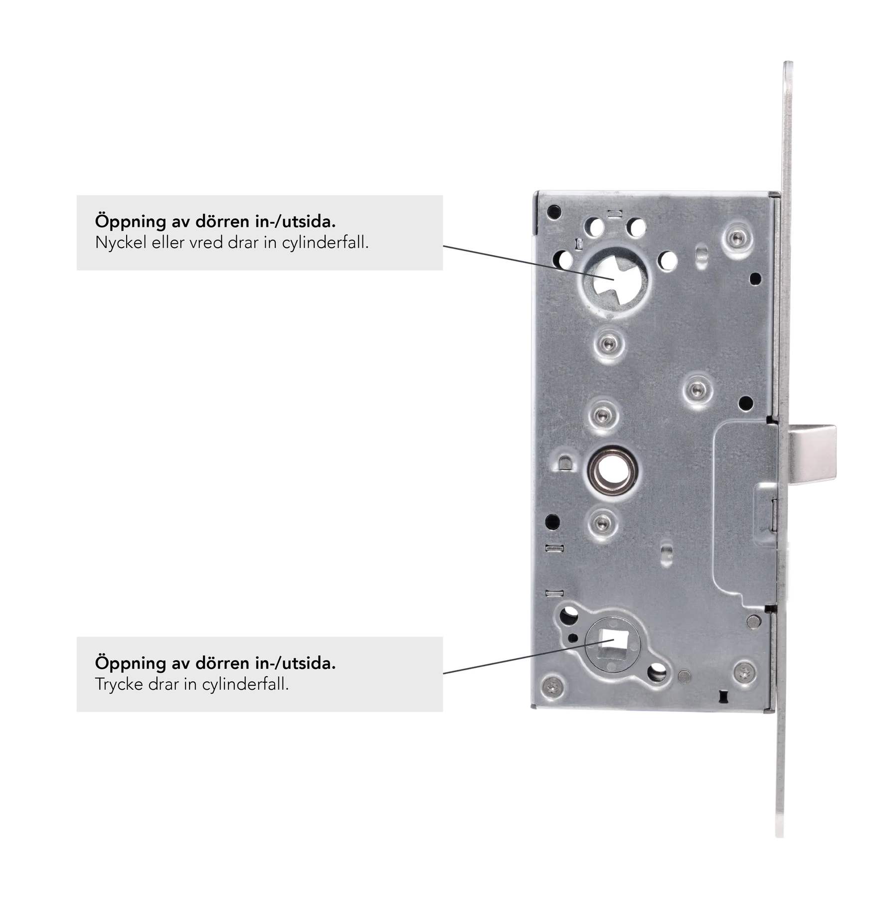 - Motsvarar ASSAs låshus 236-50 utan förreglinge / låshus 212-50 med kolven på cylinderpostion.