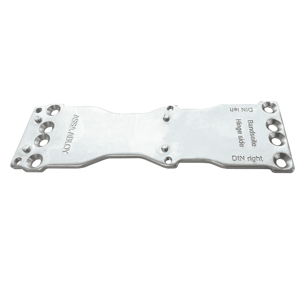 Montageplatta som används där smal karm eller överfalsat dörrblad finns.