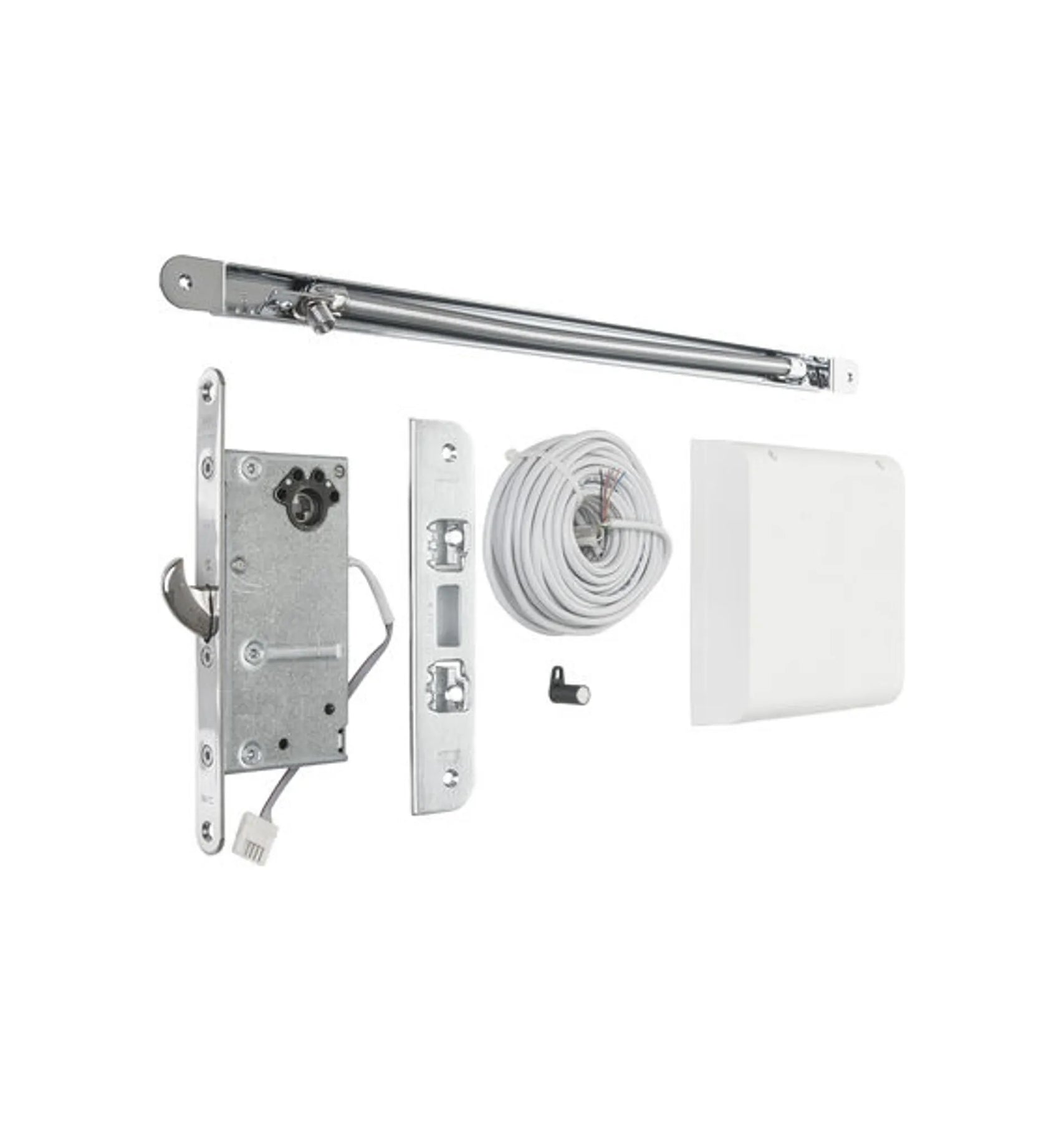 Hakregeln dras in med motor via en signal från passersystem, kodlås, tryckknapp eller liknande. Tryckesfallen dras in mekaniskt med trycket.
