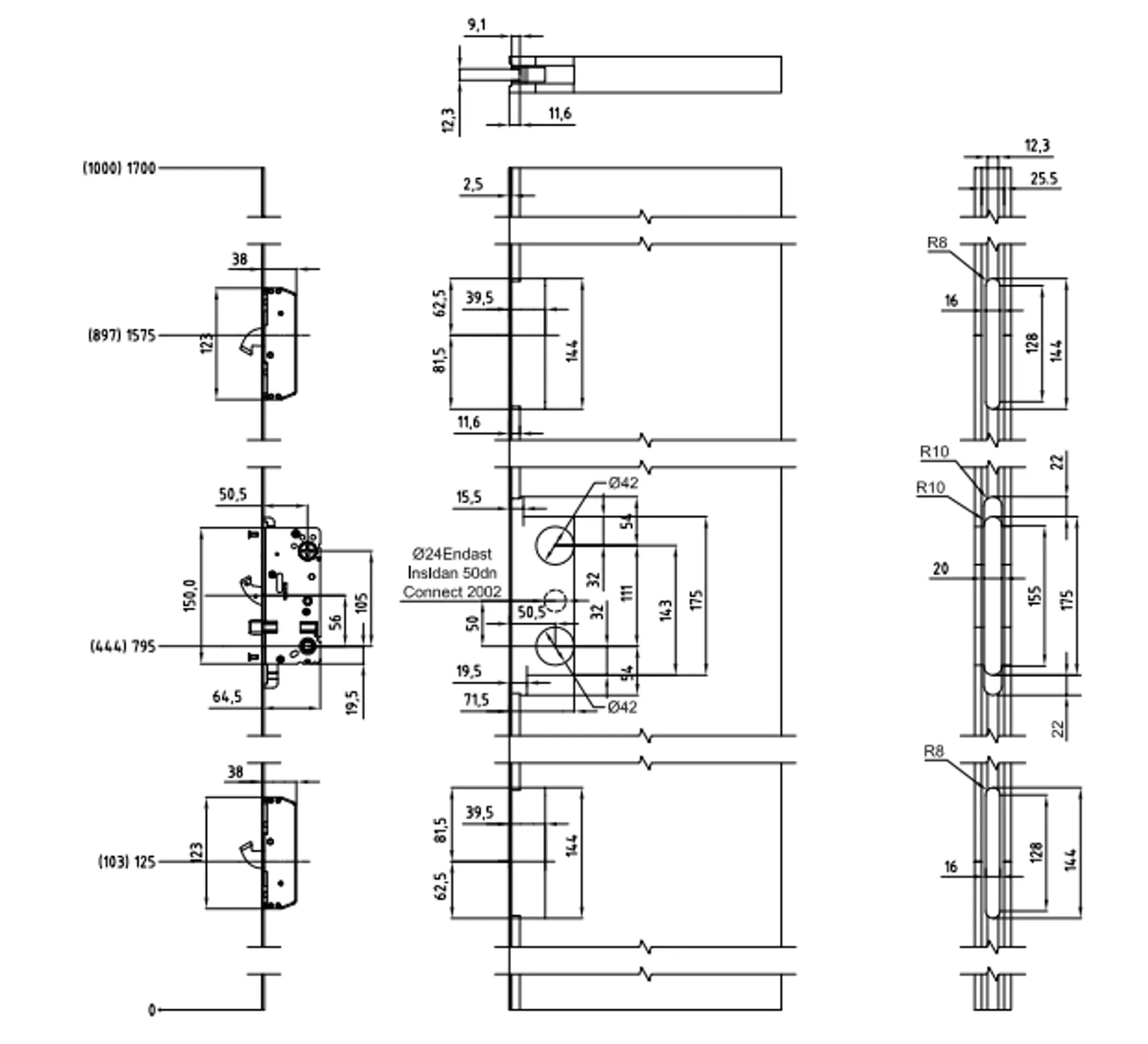 Använd Assa säkerhetsslutbleck 1487, 1487 HD eller 1489 för central låsenhet och t.ex. Assa säkerhetsslutbleck 1488 HD för hakkolvar. Assa handtag med returfjäder. Vredskylt. Rund dubbelcylinder rekommenderas.