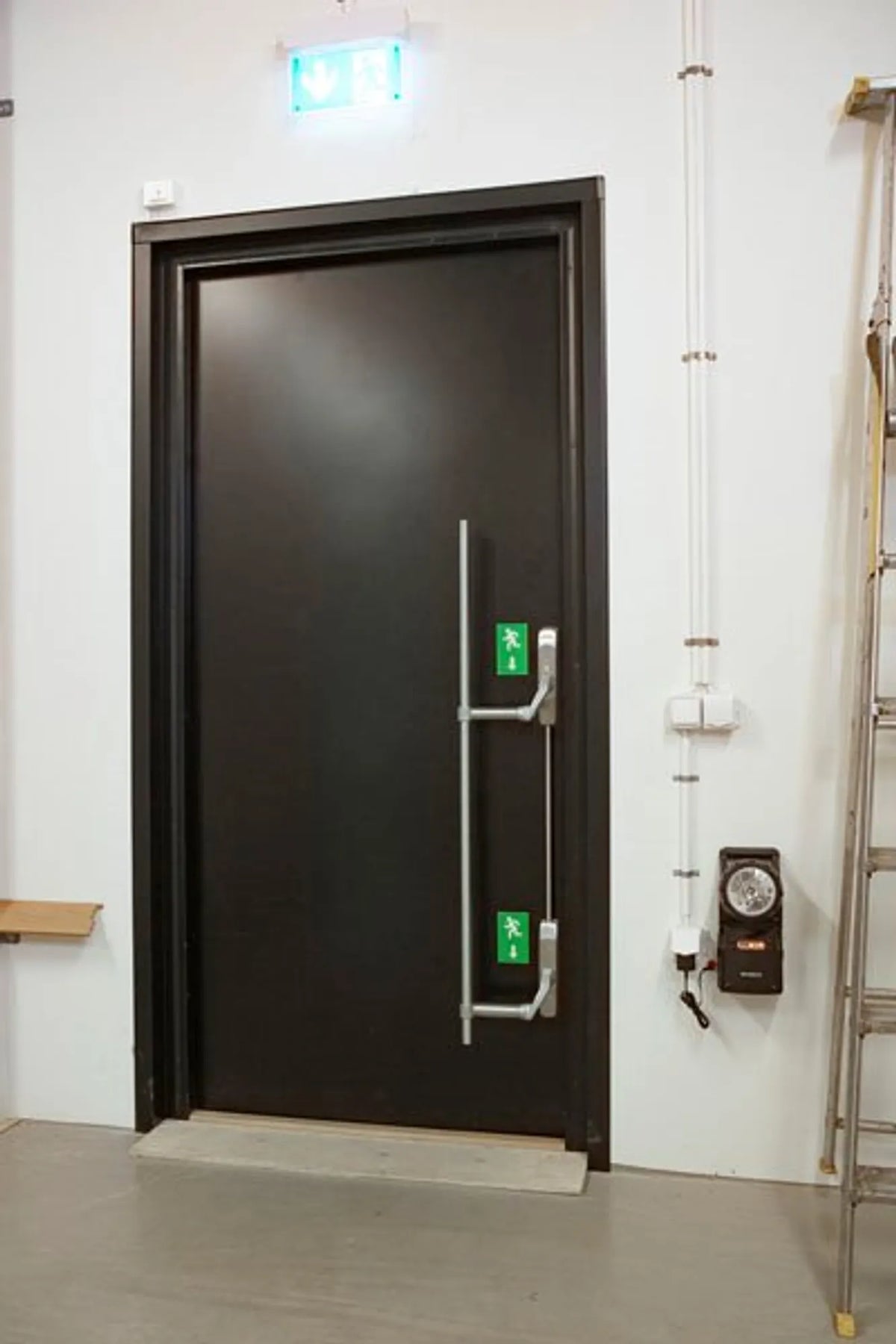 Tryck på nödöppnaren med armbåge, knä, fot eller dylikt säkerställer öppning av låshus i dörr.