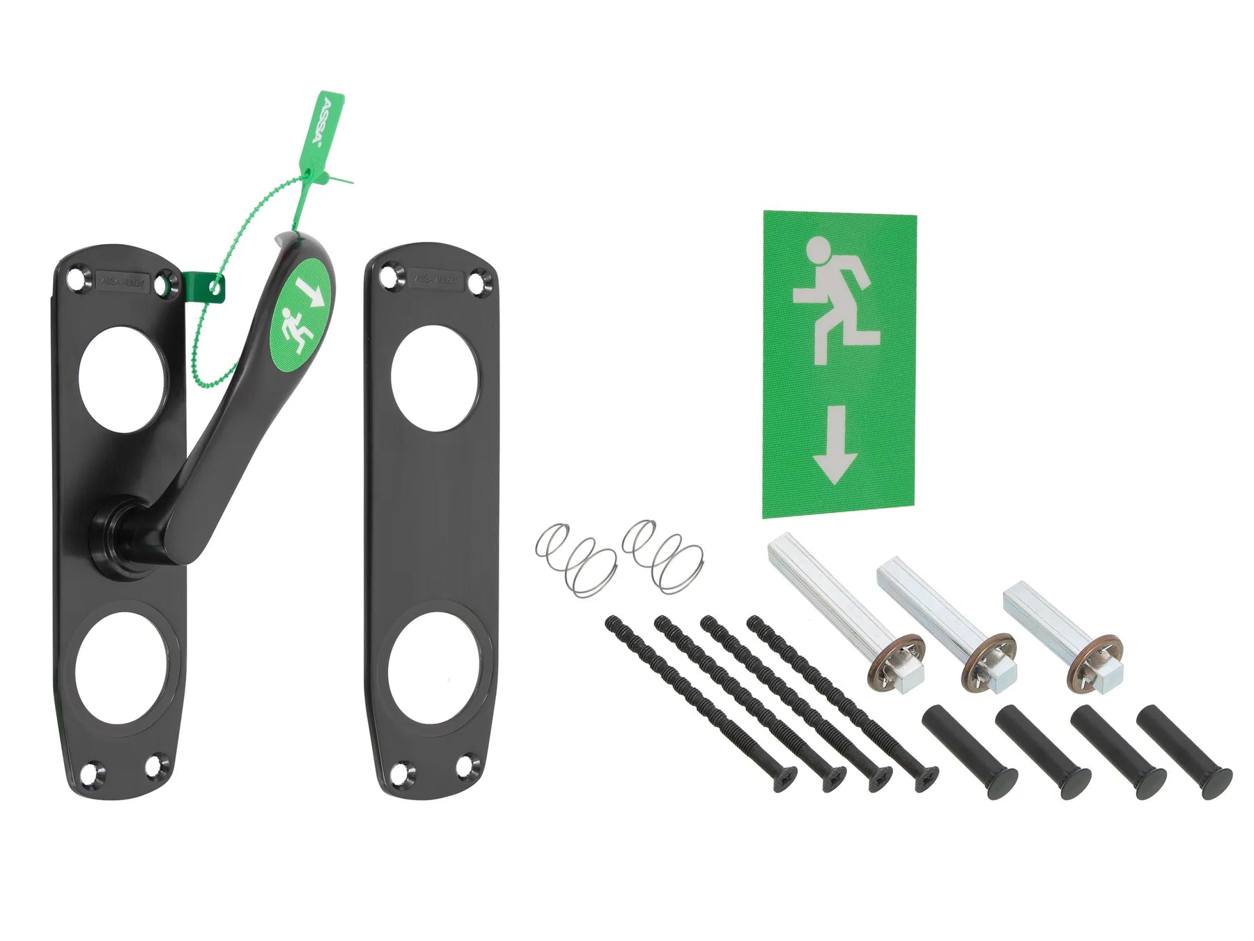 Nödutrymningsbeslag 179A vä i mirus svart är avsett för utåtgående slagdörrar i utrymningsvägar. 179A passar tillsammans med låshus 710, 721, 722 med 50 eller 70 mm dorndjup. Låset öppnas med ett handgrepp, vilket ger en säker utrymning.