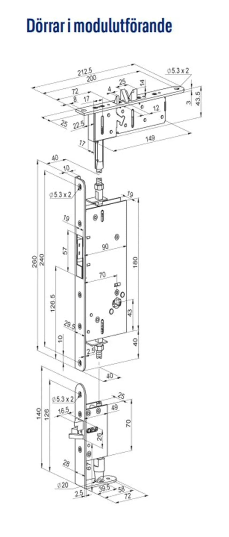 - Slutblecksenhet, stänger och låsreglar monteras infällt i dörrbladet Slutblecksenhet kräver min 90 mm profilbredd