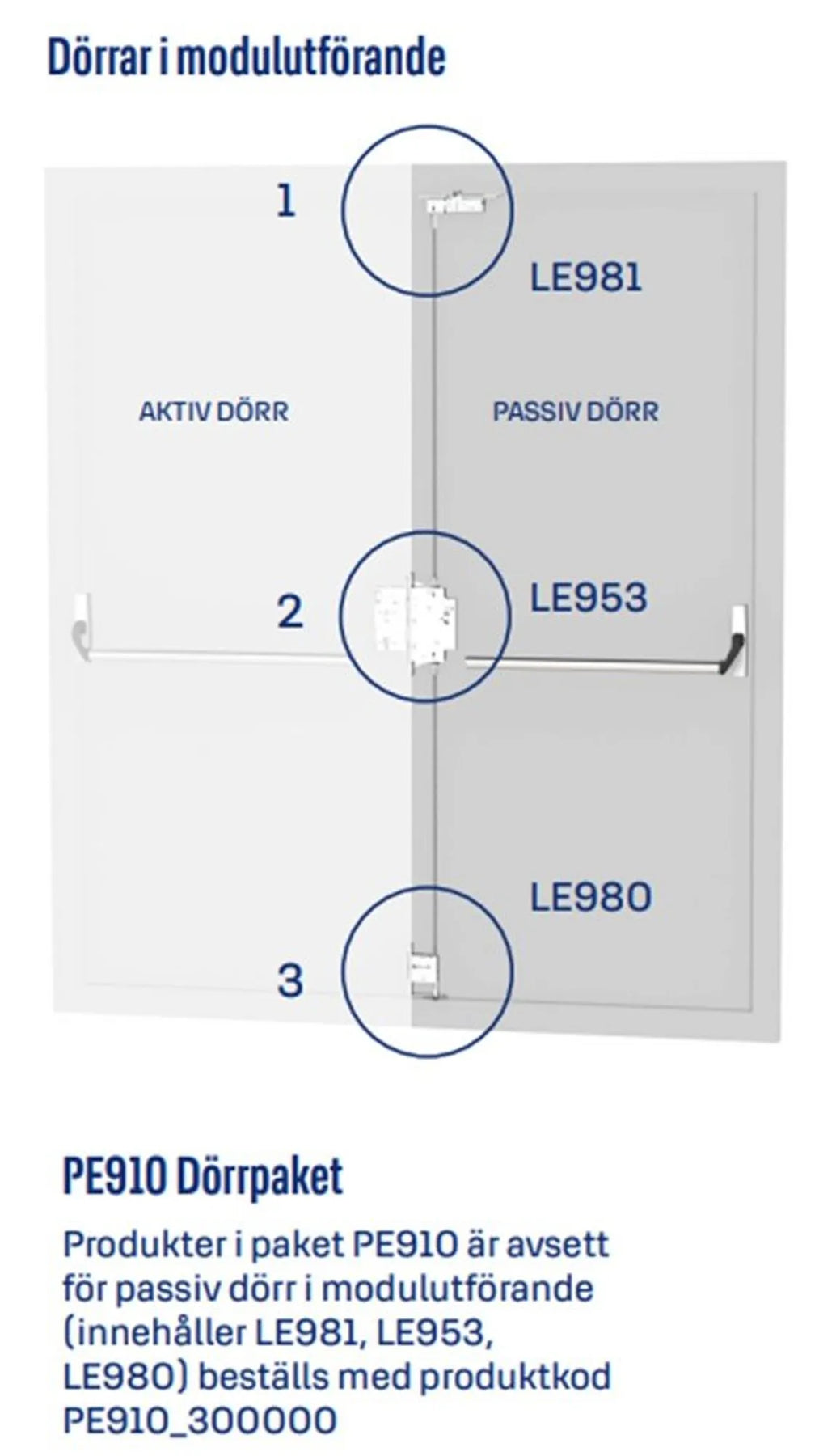 - Innehåll i paket PE913: panikregel PBE002, mittenlås LE953, bottenlås LE980, topplås PE951, kabel EA221, karmöverföring EA281, sammankopplande stänger
