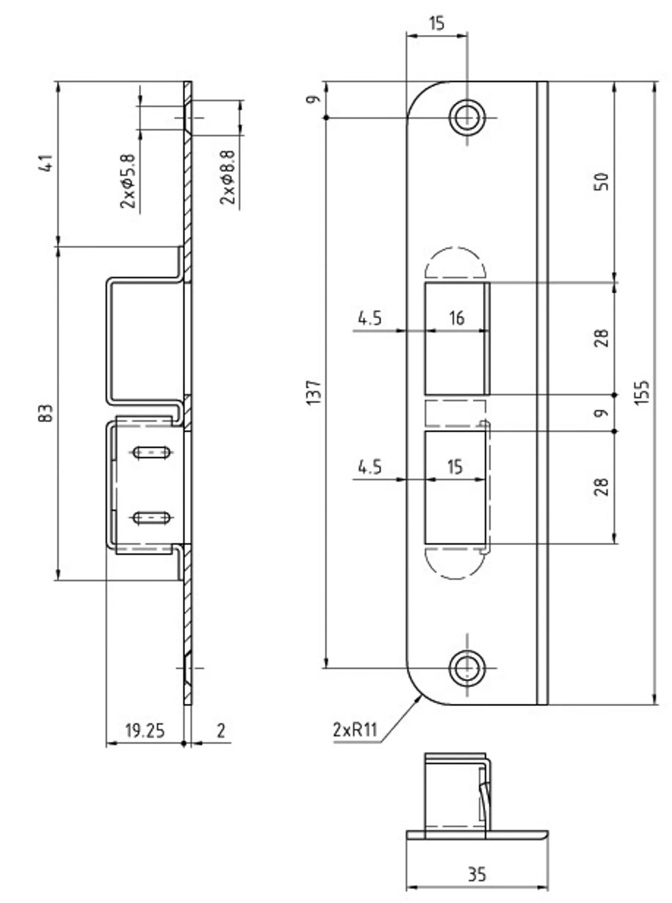 - Framkanten på slutblecket är rundad för att minska friktionen mellan slutbleck och låsets fall.