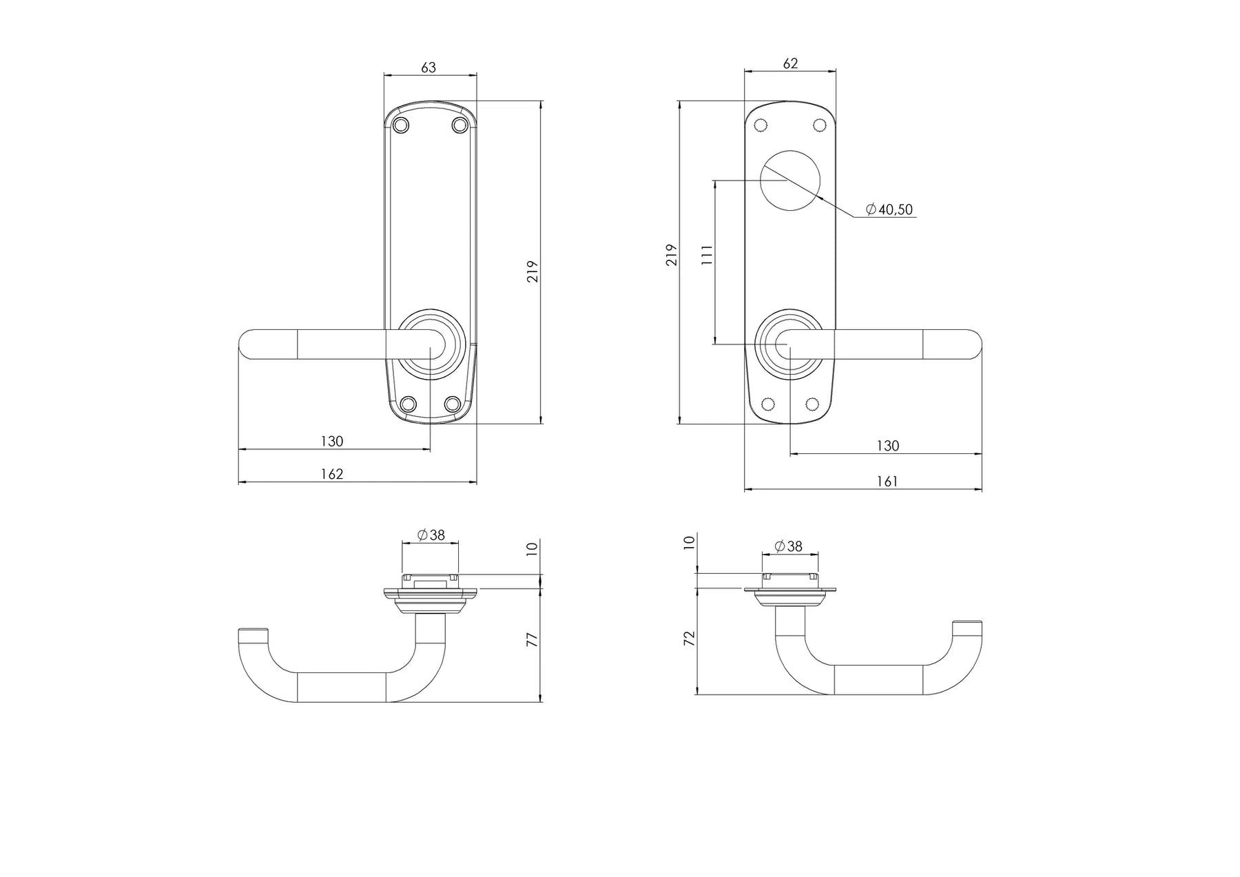 Beslagets utsida: Yttre trycke används för att öppna dörren från utsida efter behörig upplåsning. Urtag för cylinder på utsidan.